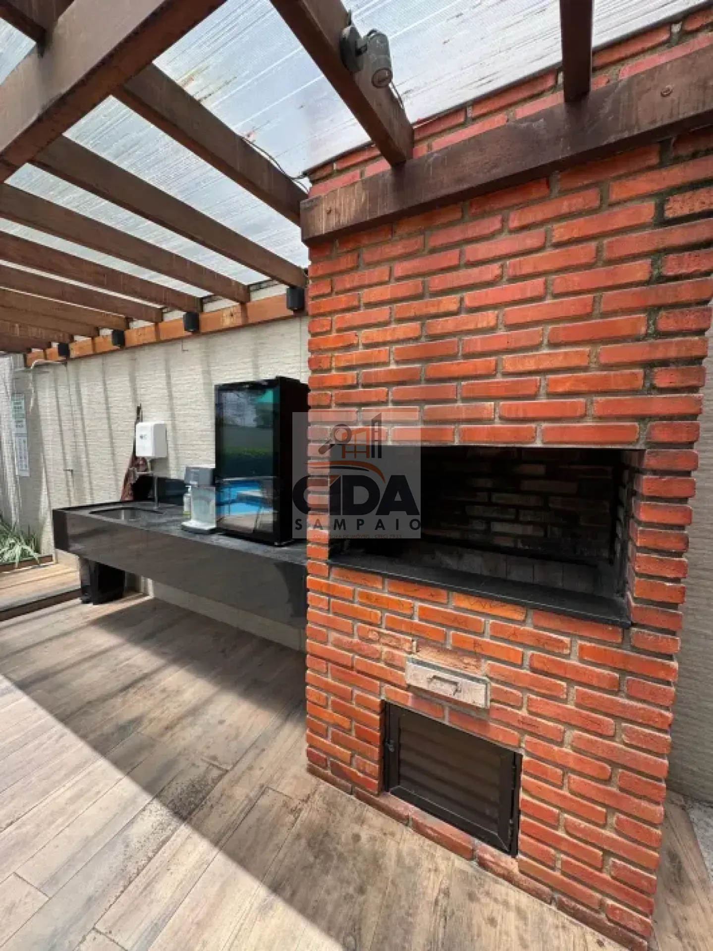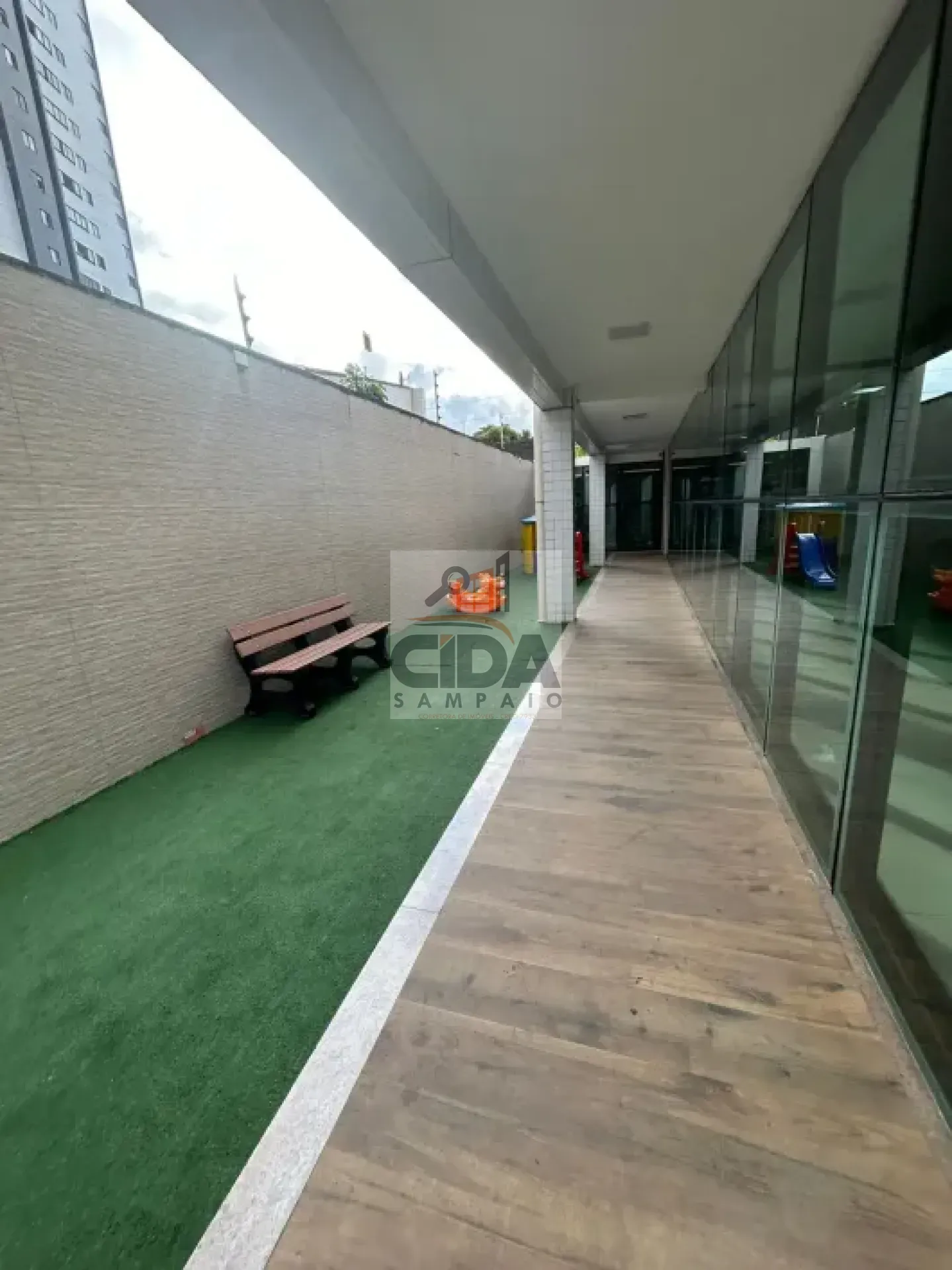 Possui espaço jardinado, área de brinquedo para as crianças, espaço para festas.